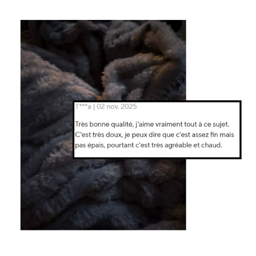 📍 Quel est le matériau utilisé pour cette couverture ? Notre couverture est fabriquée en microfibre polyester de haute qualité, douce au toucher et respirante. Ce matériau offre une chaleur durable, une excellente résistance à l’usure et garde son aspect pelucheux lavage après lavage.